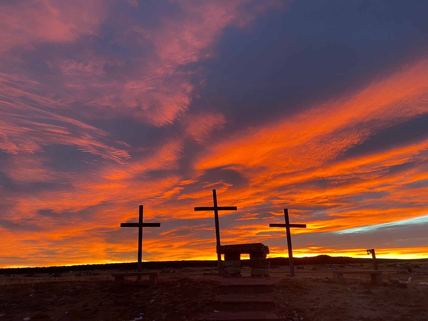 One of the features I loved about my last church in Colorado was our outdoor worship space. On a small hill above our parking lot, some of the men had put up three life-sized wooden crosses as a way for people passing by on the highway to recognize the church. I liked those crosses so much that I wanted to develop the site a bit more. We had Boy Scouts earning their eagle badges put in a platform of paving stones around the crosses and steps leading up to them. The art committee added a stone altar table so that we could do outdoor services there, and some benches for people to sit and reflect. It was a beautiful setting, especially when the sunrise came up behind those crosses. I treasure those incredible pictures.